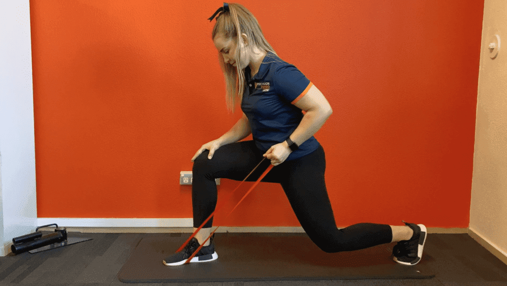 - Place the mini band around your foot and maintain your weight in your front foot whilst hinging forwards from your hips
